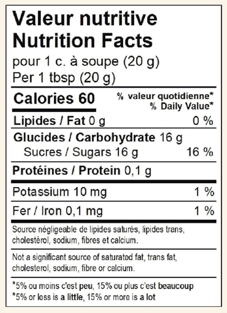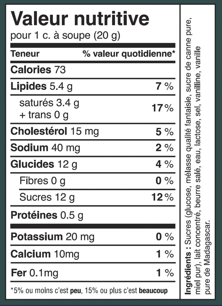 Ingrédients : Sucres (glucose, mélasse qualité fantaisie. sucre de canne pure, miel pur), lait concentré, beurre salé, eau, lactose, sel, vanilline, vanille pure de Madagascar.